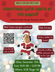Come ring in the Christmas season with Santa and horses, it doesn’t get any better than that! We will be selling treats and refreshments as well as $5.00 horse back rides. We will have supplies for folks to write letters to Santa as well as a visit and pictures with him! Tell your friends and family! RSVP with the link below! https://docs.google.com/forms/d/1PZK29W0u0ozGYHezjqKUELlnWKa2f8a0qW0EYeKFric/edit