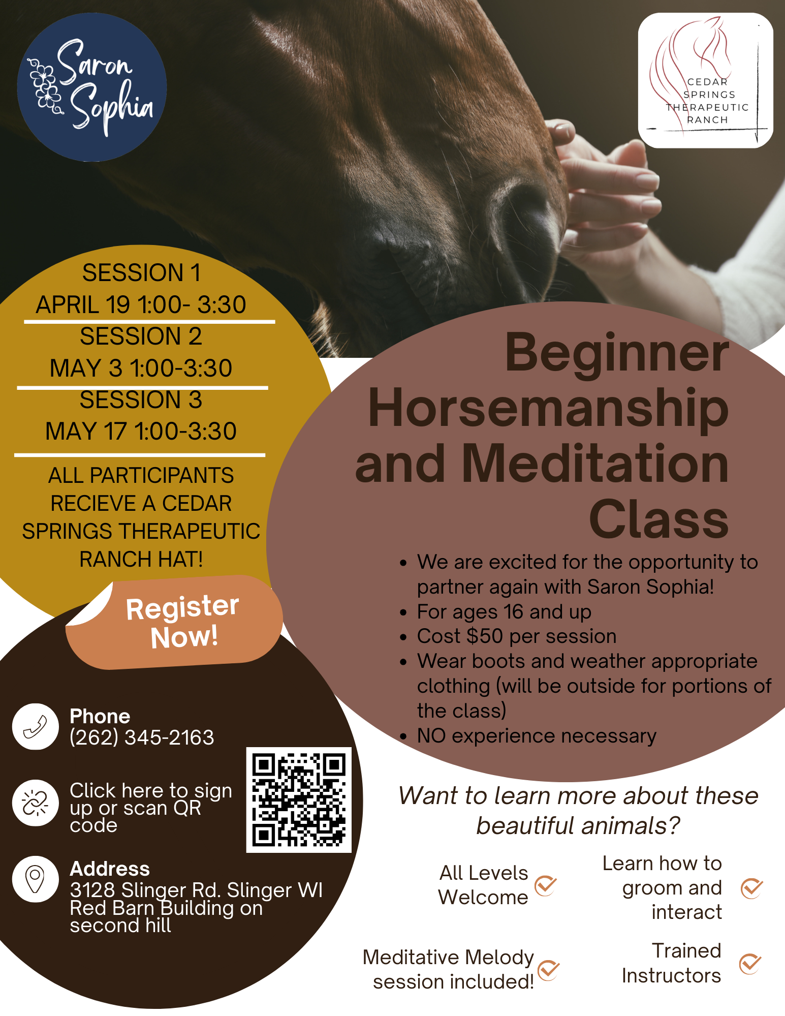Come meet the animals at Cedar Springs Therapeutic Horse Ranch! Kiss a horse, play some games, decorate cookies, and eat lunch with us!